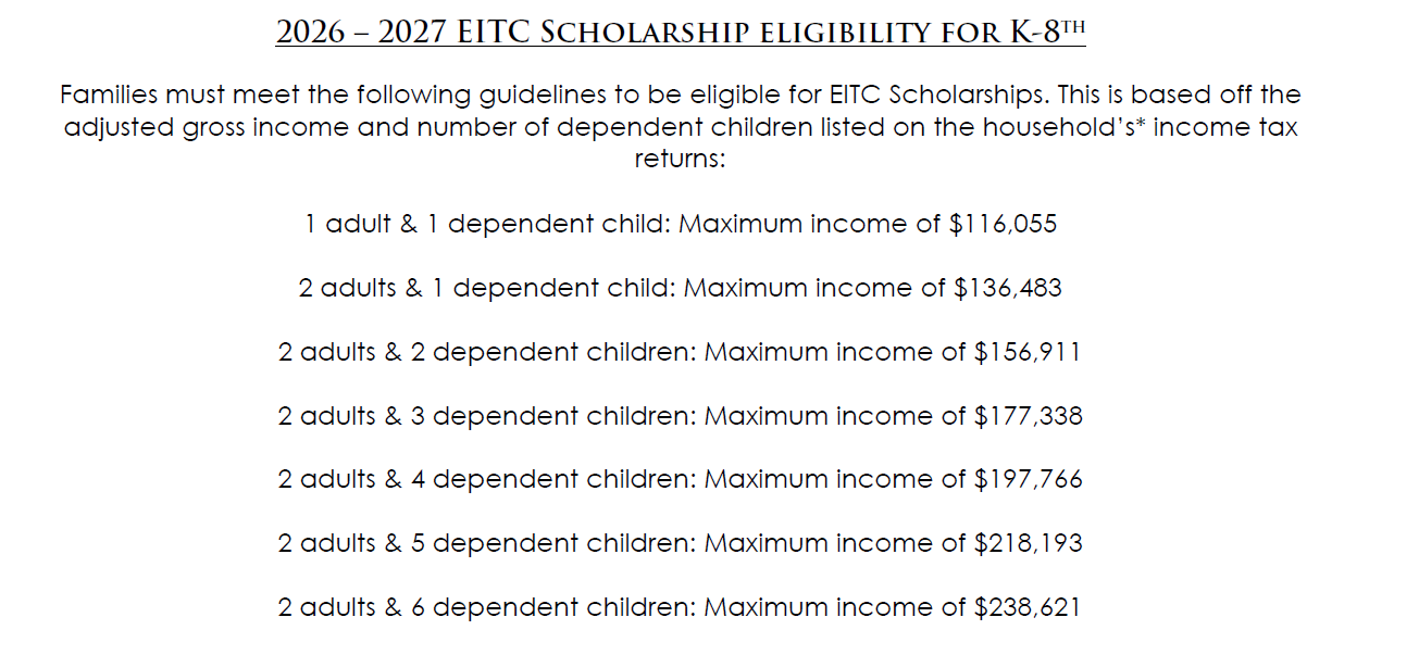 Variable tuition adjusts tuition for qualifying families based on financial needs. Funds for variable tuition are provided through the PA Educational Improvement Tax Credit (EITC) Scholarship Program. Scholarship awards are based upon the state benchmark requirements for financial aid. The 26-27 scholarship guidelines are: